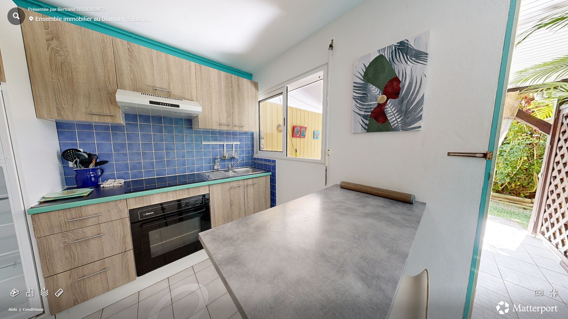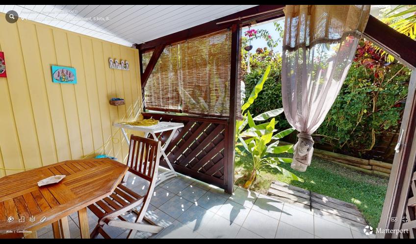 En entrant dans le logement T1 Alpinia cotés cours vous arrivez dans son entrée privative, qui vous conduira en descendant 4 marches, au rez de Jardin desservant la chambre, cuisine equipée ainsi que la terrasse couverte donnant dans le jardin tropical avec un accès direct a la piscine au sel a quelques pas de là.